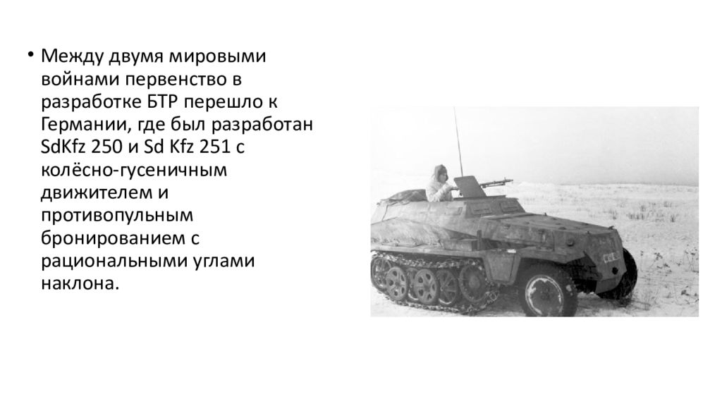 Между двумя мировыми войнами первенство в разработке БТР перешло к Германии, где был разработан SdKfz 250 и Sd Kfz 251 с колёсно-гусеничным движителем и противопульным бронированием с рациональными углами наклона.