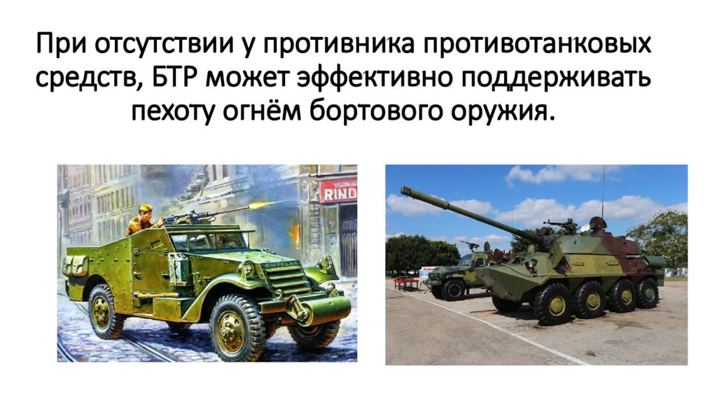 Слайд 2: При отсутствии у противника противотанковых средств, БТР может эффективно поддерживать пехоту огнём бортового оружия