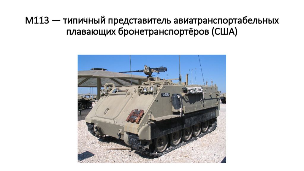 Слайд 11: M113 — типичный представитель авиатранспортабельных плавающих бронетранспортёров (США)