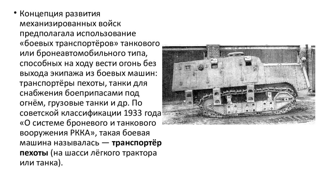 Концепция развития механизированных войск предполагала использование «боевых транспортёров» танкового или бронеавтомобильного типа, способных на ходу вести огонь без выхода экипажа из боевых машин: транспортёры пехоты, танки для снабжения боеприпасами под огнём, грузовые танки и др. По советской классификации 1933 года «О системе броневого и танкового вооружения РККА», такая боевая машина называлась — транспортёр пехоты (на шасси лёгкого трактора или танка).