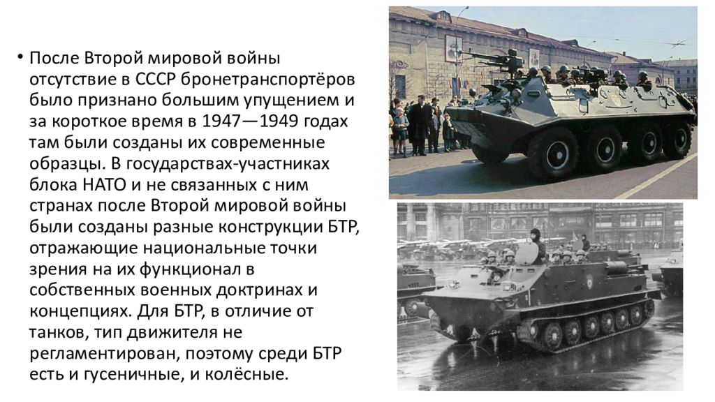 После Второй мировой войны отсутствие в СССР бронетранспортёров было признано большим упущением и за короткое время в 1947—1949 годах там были созданы их современные образцы. В государствах-участниках блока НАТО и не связанных с ним странах после Второй мировой войны были созданы разные конструкции БТР, отражающие национальные точки зрения на их функционал в собственных военных доктринах и концепциях. Для БТР, в отличие от танков, тип движителя не регламентирован, поэтому среди БТР есть и гусеничные, и колёсные.