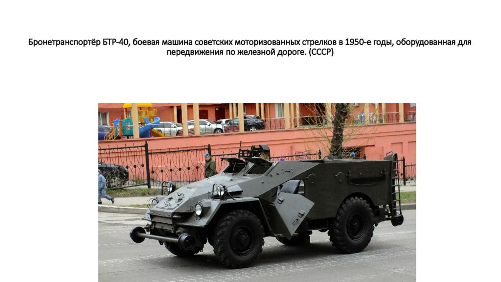 Слайд 15: Бронетранспортёр БТР-40, боевая машина советских моторизованных стрелков в 1950-е годы, оборудованная для передвижения по железной дороге. (СССР)