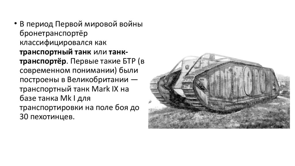 В период Первой мировой войны бронетранспортёр классифицировался как транспортный танк или танк-транспортёр. Первые такие БТР (в современном понимании) были построены в Великобритании — транспортный танк Mark IX на базе танка Mk I для транспортировки на поле боя до 30 пехотинцев.