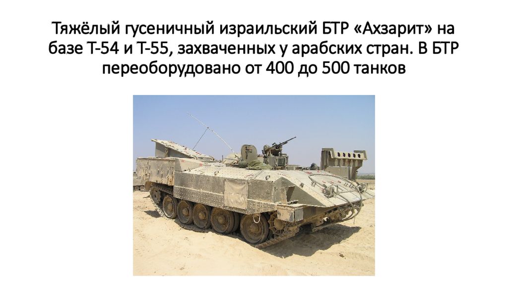 Слайд 14: Тяжёлый гусеничный израильский БТР « Ахзарит » на базе Т-54 и Т-55, захваченных у арабских стран. В БТР переоборудовано oт 400 дo 500 танков
