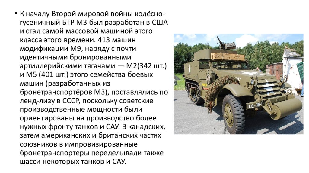 К началу Второй мировой войны колёсно-гусеничный БТР М3 был разработан в США и стал самой массовой машиной этого класса этого времени. 413 машин модификации М9, наряду с почти идентичными бронированными артиллерийскими тягачами — М2(342 шт.) и М5 (401 шт.) этого семейства боевых машин (разработанных из бронетранспортёров М3), поставлялись по ленд-лизу в СССР, поскольку советские производственные мощности были ориентированы на производство более нужных фронту танков и САУ. В канадских, затем американских и британских частях союзников в импровизированные бронетранспортеры переделывали также шасси некоторых танков и САУ.
