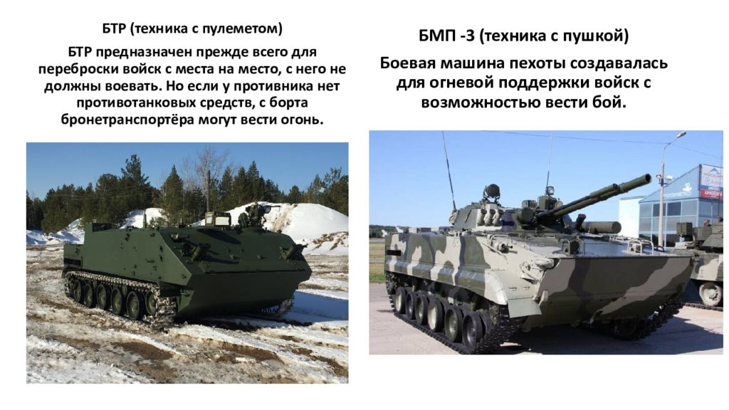 БТР (техника с пулеметом) БТР предназначен прежде всего для переброски войск с места на место, с него не должны воевать. Но если у противника нет противотанковых средств, с борта бронетранспортёра могут вести огонь. БМП -3 (техника с пушкой) Боевая машина пехоты создавалась для огневой поддержки войск с возможностью вести бой.