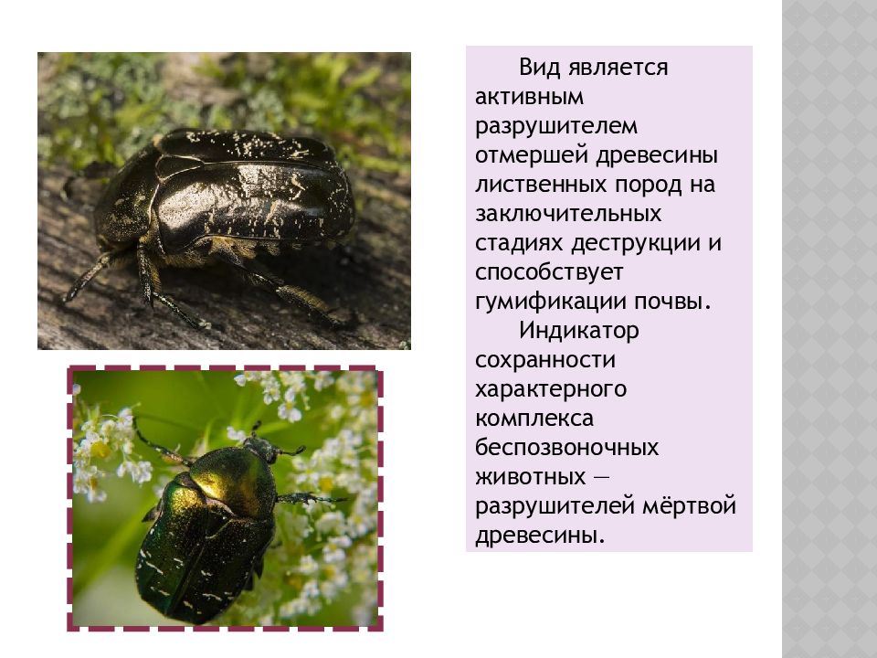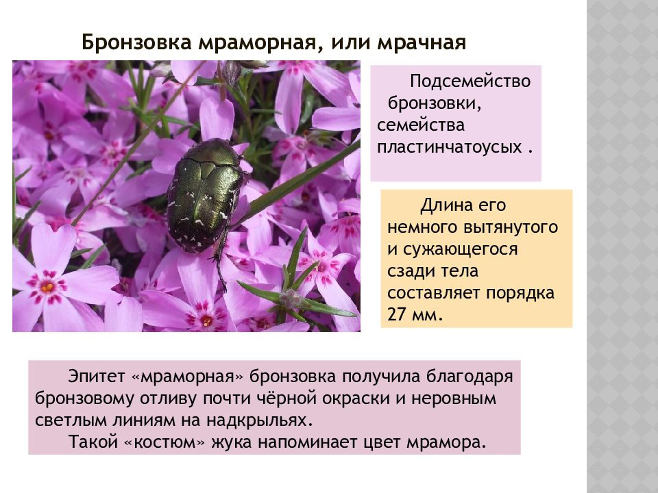 Бронзовка мраморная, или мрачная Длина его немного вытянутого и сужающегося сзади тела составляет порядка 27 мм. Подсемейство бронзовки, семейства пластинчатоусых. Эпитет «мраморная» бронзовка получила благодаря бронзовому отливу почти чёрной окраски и неровным светлым линиям на надкрыльях. Такой «костюм» жука напоминает цвет мрамора.