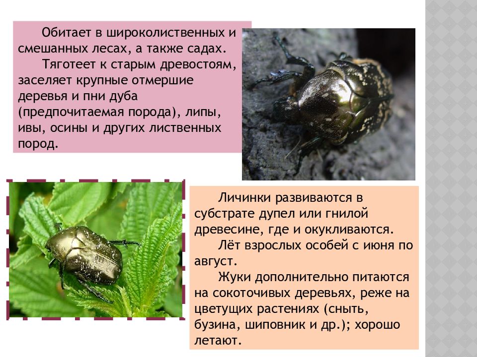 Личинки развиваются в субстрате дупел или гнилой древесине, где и окукливаются. Лёт взрослых особей с июня по август. Жуки дополнительно питаются на сокоточивых деревьях, реже на цветущих растениях (сныть, бузина, шиповник и др.); хорошо летают. Обитает в широколиственных и смешанных лесах, а также садах. Тяготеет к старым древостоям, заселяет крупные отмершие деревья и пни дуба (предпочитаемая порода), липы, ивы, осины и других лиственных пород.