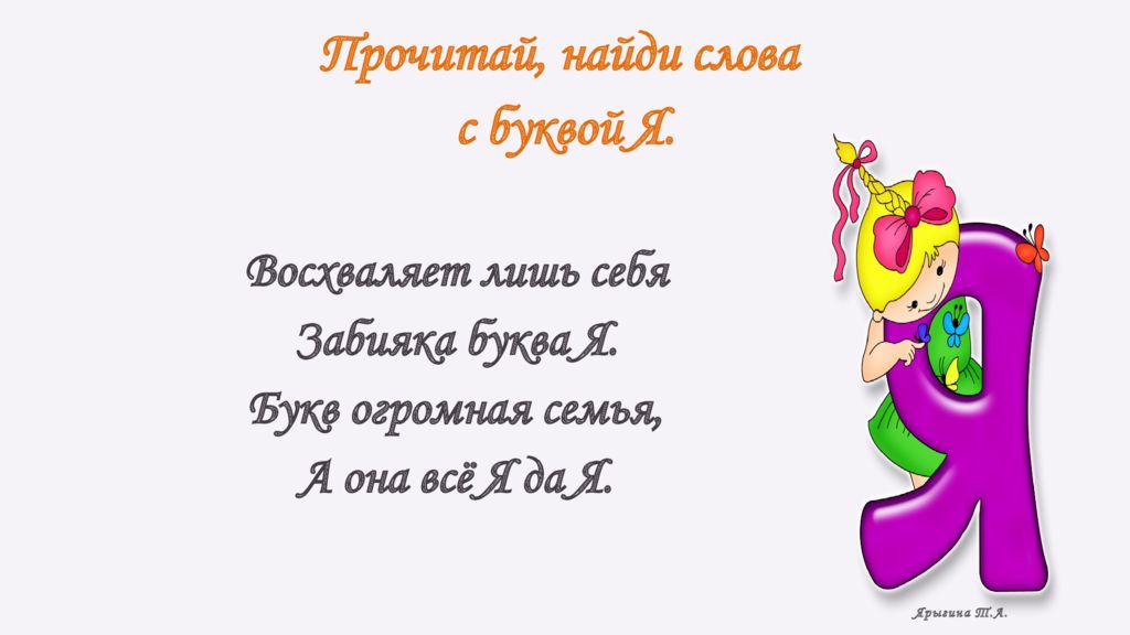 Восхваляет лишь себя Забияка буква Я. Букв огромная семья, А она всё Я да Я. Прочитай, найди слова с буквой Я. Ярыгина Т.А.