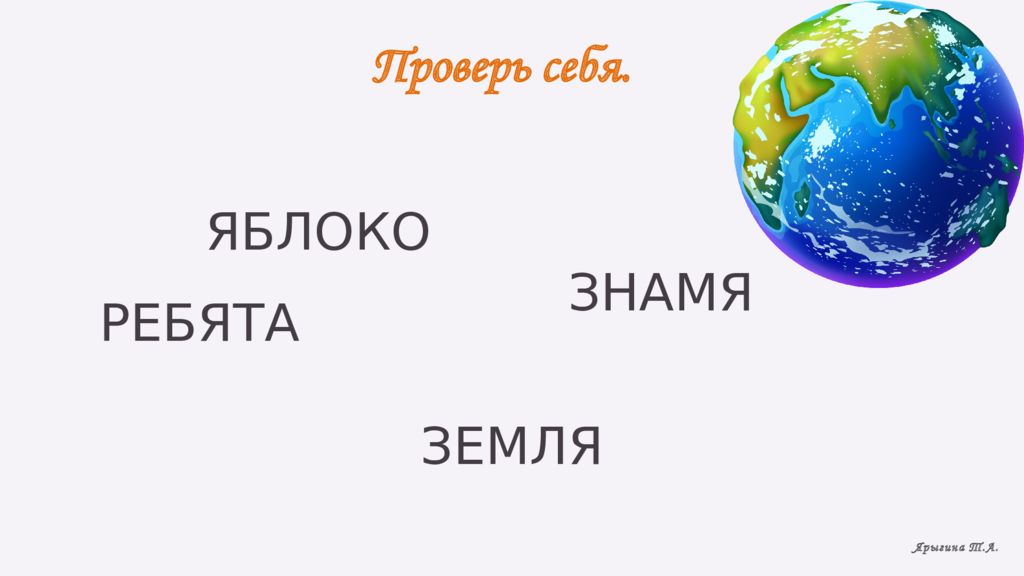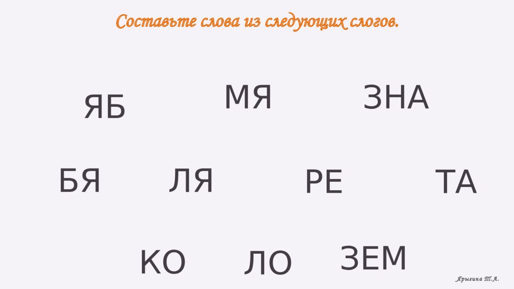 Составьте слова из следующих слогов. ЯБ МЯ ЗНА БЯ ЛЯ РЕ ТА КО ЛО ЗЕМ Ярыгина Т.А.
