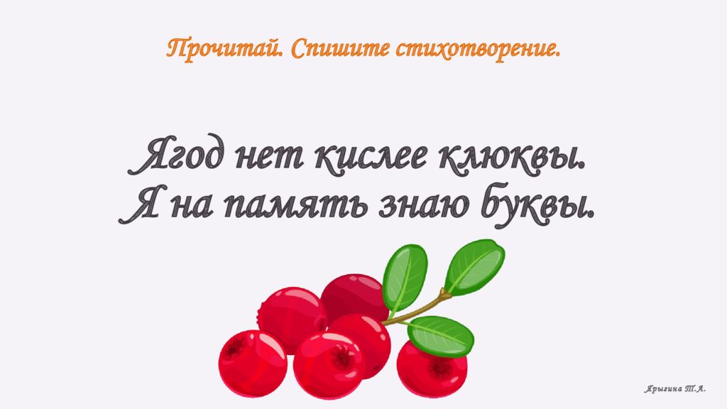 Прочитай. Спишите стихотворение. Ягод нет кислее клюквы. Я на память знаю буквы. Ярыгина Т.А.