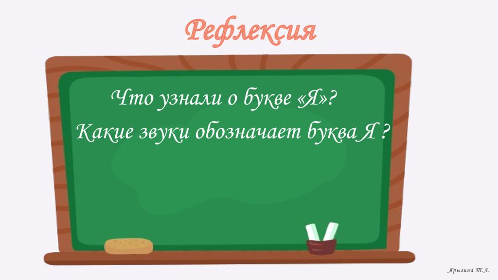 Рефлексия Что узнали о букве «Я» ? Какие звуки обозначает буква Я ? Ярыгина Т.А.