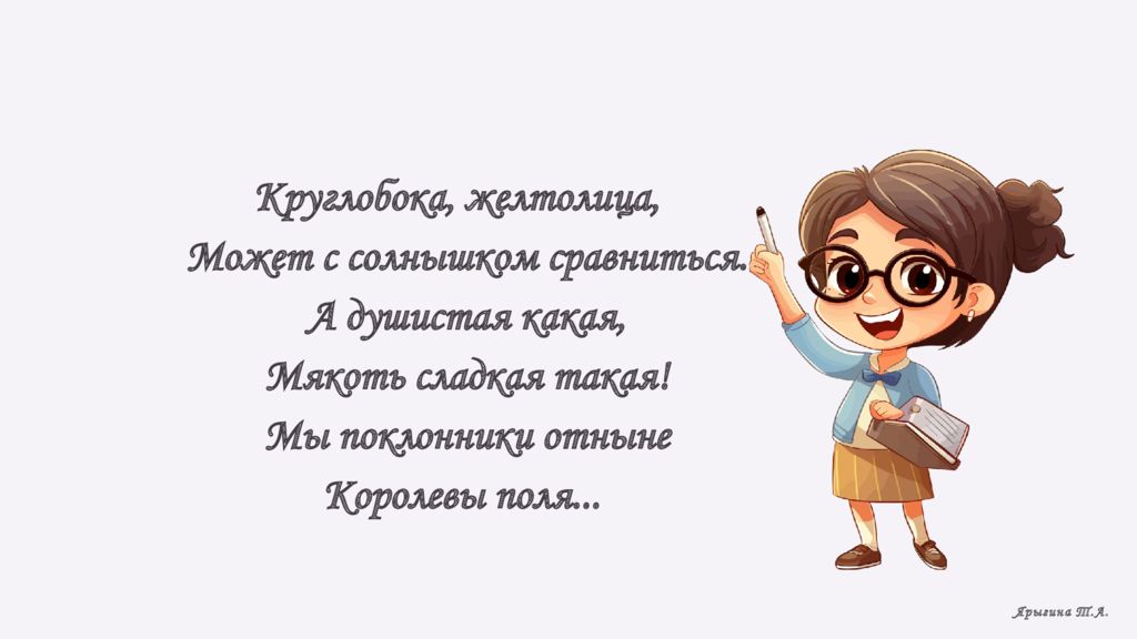 Круглобока, желтолица, Может с солнышком сравниться. А душистая какая, Мякоть сладкая такая ! Мы поклонники отныне Королевы поля... Ярыгина Т.А.