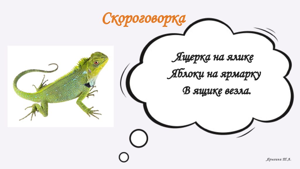 Скороговорка Ящерка на ялике Яблоки на ярмарку В ящике везла. Ярыгина Т.А.