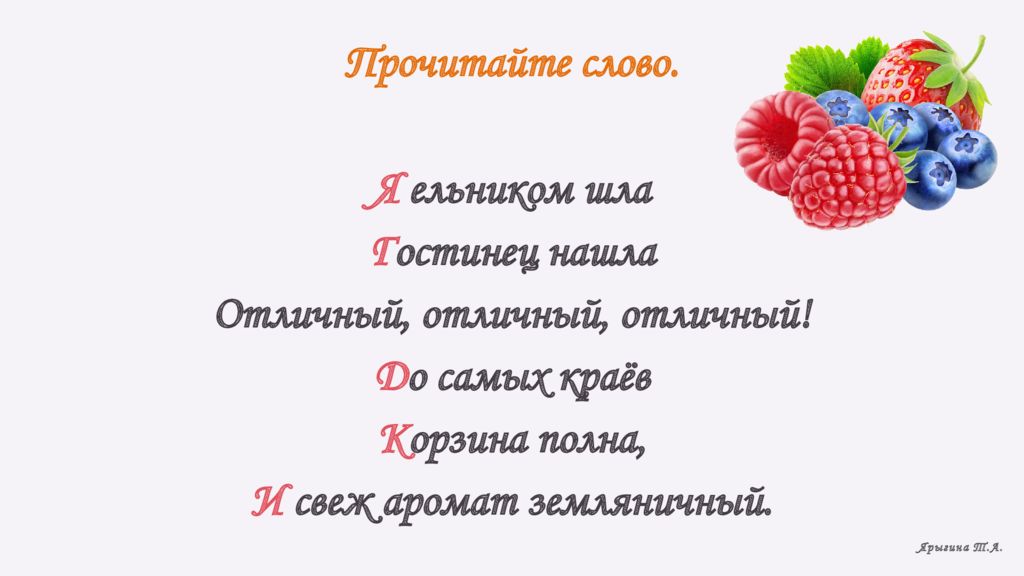 Я ельником шла Г остинец нашла Отличный, отличный, отличный ! Д о самых краёв К орзина полна, И свеж аромат земляничный. Прочитайте слово. Ярыгина Т.А.