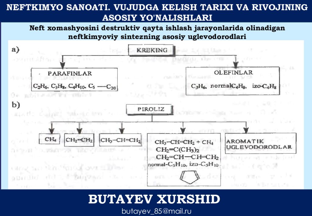 NEFTKIMYO SANOATI. VUJUDGA KELISH TARIXI VA RIVOJINING ASOSIY YO'NALISHLARI BUTAYEV XURSHID butayev_85@mail.ru Neft xomashyosini destruktiv qayta ishlash jarayonlarida olinadigan neftkimyoviy sintezning asosiy uglevodorodlari