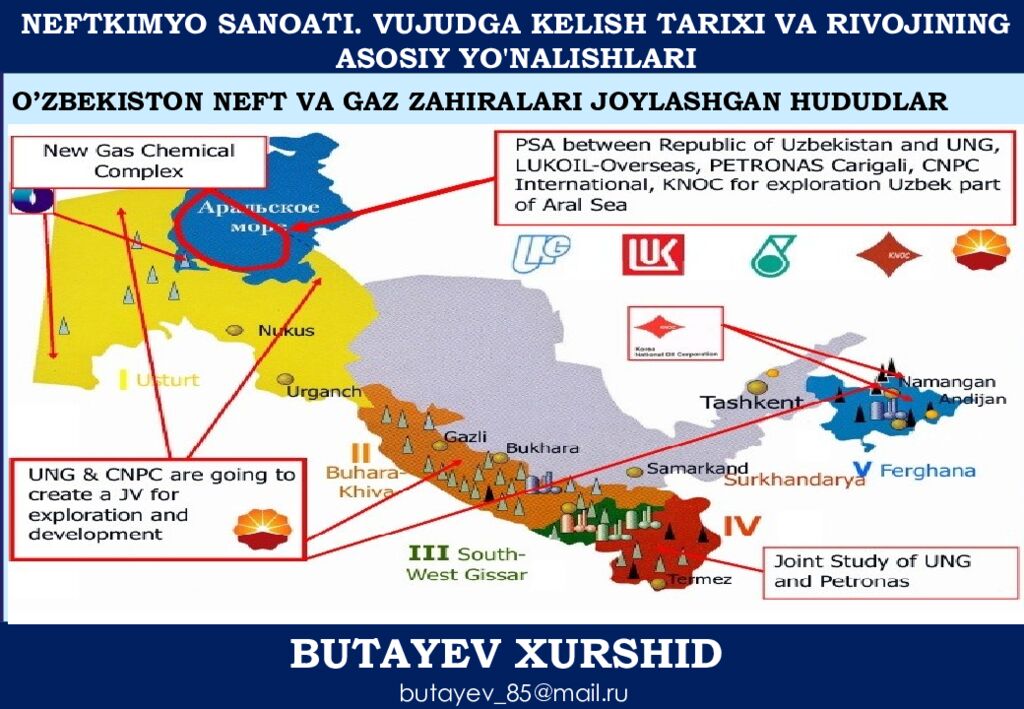 NEFTKIMYO SANOATI. VUJUDGA KELISH TARIXI VA RIVOJINING ASOSIY YO'NALISHLARI BUTAYEV XURSHID butayev_85@mail.ru O’ZBEKISTON NEFT VA GAZ ZAHIRALARI JOYLASHGAN HUDUDLAR