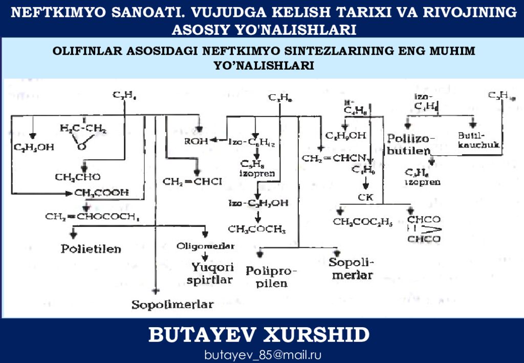 NEFTKIMYO SANOATI. VUJUDGA KELISH TARIXI VA RIVOJINING ASOSIY YO'NALISHLARI BUTAYEV XURSHID butayev_85@mail.ru OLIFINLAR ASOSIDAGI NEFTKIMYO SINTEZLARINING ENG MUHIM YO’NALISHLARI