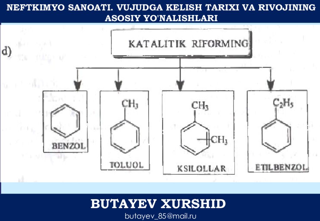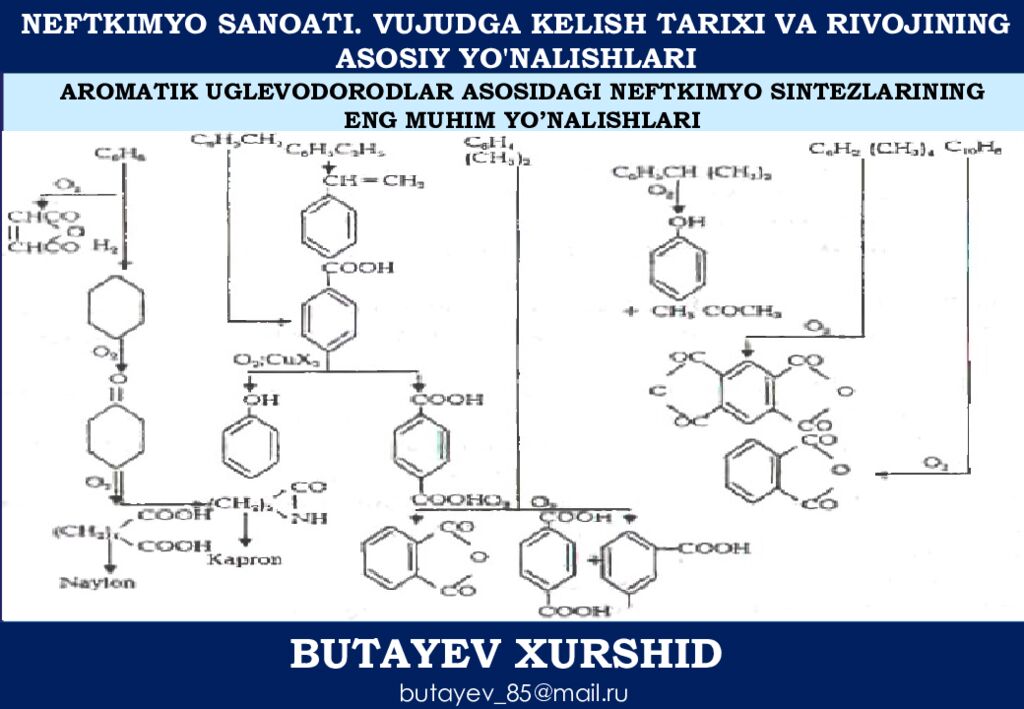 NEFTKIMYO SANOATI. VUJUDGA KELISH TARIXI VA RIVOJINING ASOSIY YO'NALISHLARI BUTAYEV XURSHID butayev_85@mail.ru AROMATIK UGLEVODORODLAR ASOSIDAGI NEFTKIMYO SINTEZLARINING ENG MUHIM YO’NALISHLARI
