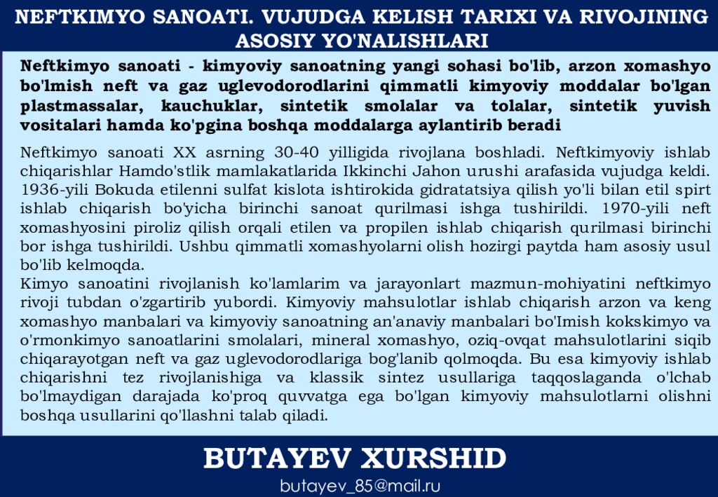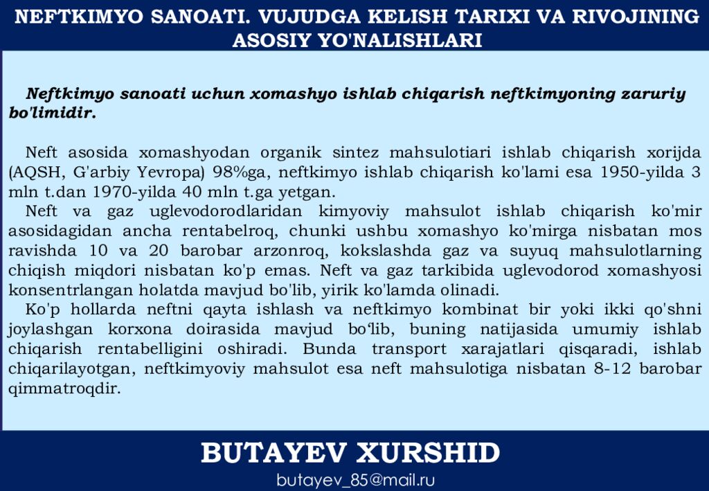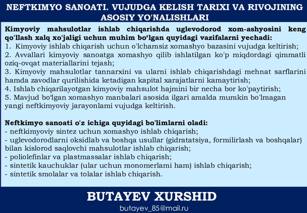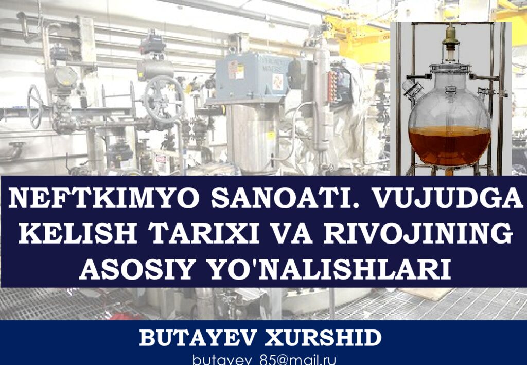 BUTAYEV XURSHID butayev_85@mail.ru NEFTKIMYO SANOATI. VUJUDGA KELISH TARIXI VA RIVOJINING ASOSIY YO'NALISHLARI