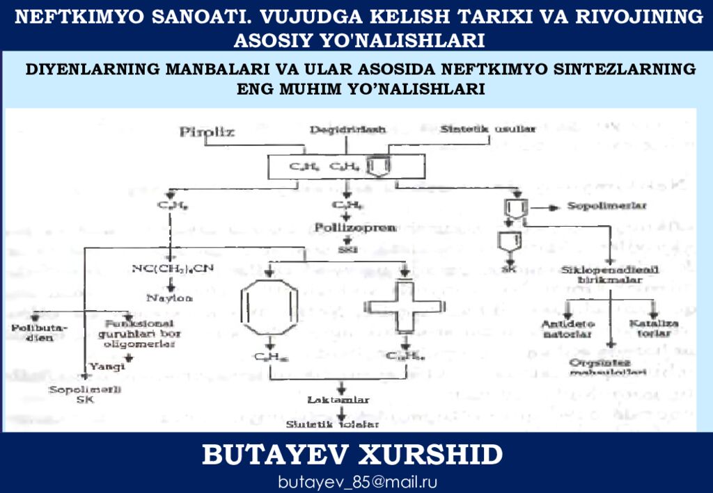 NEFTKIMYO SANOATI. VUJUDGA KELISH TARIXI VA RIVOJINING ASOSIY YO'NALISHLARI BUTAYEV XURSHID butayev_85@mail.ru DIYENLARNING MANBALARI VA ULAR ASOSIDA NEFTKIMYO SINTEZLARNING ENG MUHIM YO’NALISHLARI
