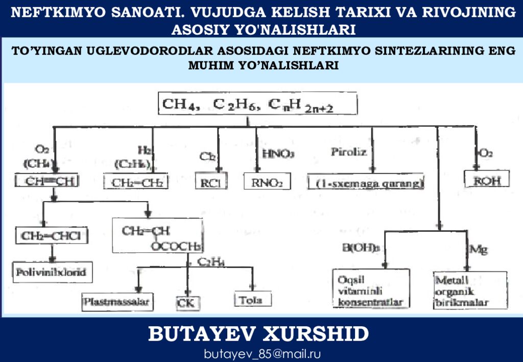 NEFTKIMYO SANOATI. VUJUDGA KELISH TARIXI VA RIVOJINING ASOSIY YO'NALISHLARI BUTAYEV XURSHID butayev_85@mail.ru TO’YINGAN UGLEVODORODLAR ASOSIDAGI NEFTKIMYO SINTEZLARINING ENG MUHIM YO’NALISHLARI