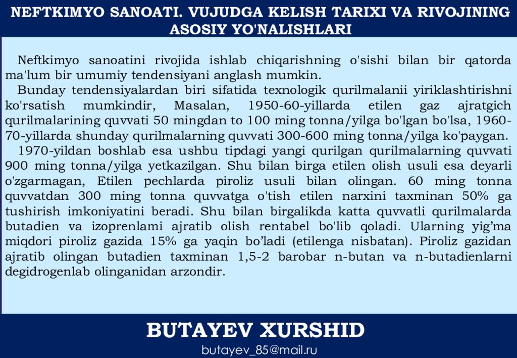 NEFTKIMYO SANOATI. VUJUDGA KELISH TARIXI VA RIVOJINING ASOSIY YO'NALISHLARI BUTAYEV XURSHID butayev_85@mail.ru Neftkimyo sanoatini rivojida ishlab chiqarishning o'sishi bilan bir qatorda ma'lum bir umumiy tendensiyani anglash mumkin. Bunday tendensiyalardan biri sifatida texnologik qurilmalanii yiriklashtirishni ko'rsatish mumkindir, Masalan, 1950-60-yillarda etilen gaz ajratgich qurilmalarining quvvati 50 mingdan to 100 ming tonna / y ilga bo'lgan bo'lsa, 1960-70-yillarda shunday qurilmalarning quvvati 300-600 ming tonna / yilga ko'paygan. 1970-yildan boshlab esa ushbu tipdagi y angi qurilgan qurilmalarning quvvati 900 ming tonna / yilga yetkazilgan. Shu bilan birga etilen olish usuli esa deyarli o'zgarmagan, Etilen pechlarda piroliz usuli bilan olingan. 60 ming tonna quvvatdan 300 ming tonna quvvatga o'tish etilen narxini taxminan 50% ga tushirish imkoniyatini beradi. Shu bilan birgalikda katta quvvatli qurilmalarda butadien va izoprenlami ajratib olish rentabel bo'lib qoladi. Ularning yig’ma miqdori piroliz gazida 15% ga yaqin bo’ladi ( etilenga nisbatan ). Piroliz gazidan ajratib olingan butadien taxminan 1,5-2 barobar n- butan va n- butadienlarni degidrogenlab olinganidan arzondir.