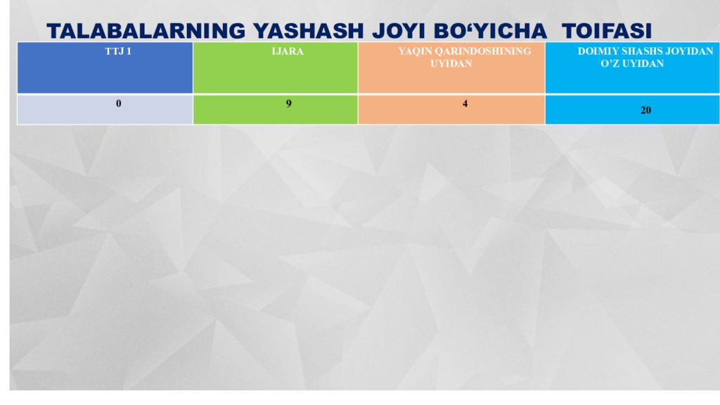TALABALARNING YASHASH JOYI BO‘YICHA TOIFASI TTJ 1 IJARA YAQIN QARINDOSHINING UYIDAN DOIMIY SHASHS JOYIDAN O’Z UYIDAN 0 9 4 20