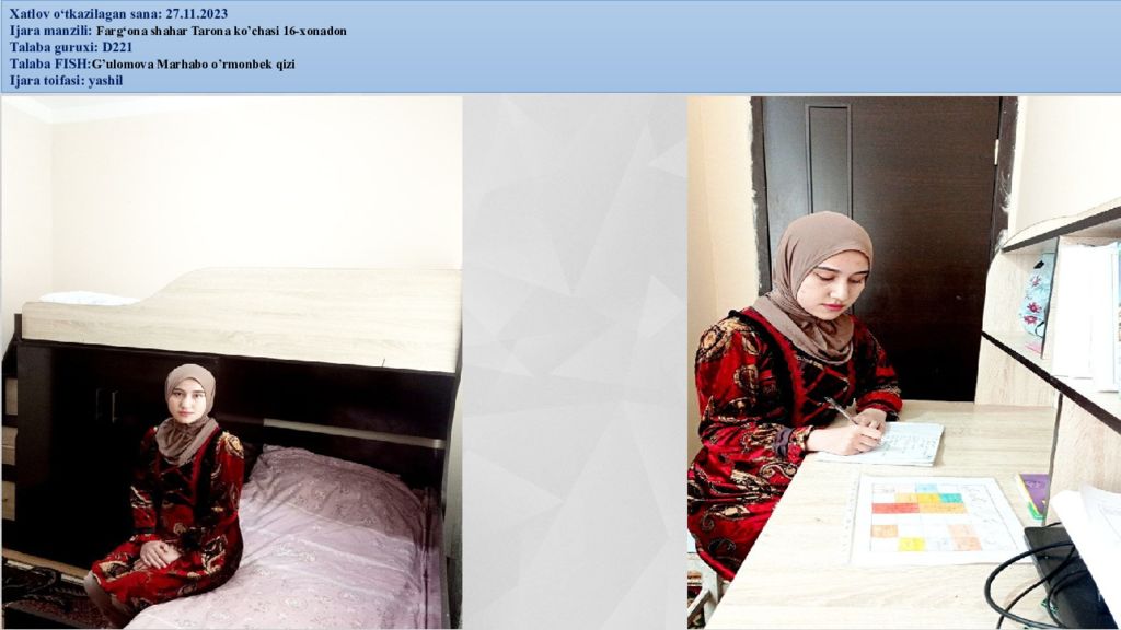 Xatlov o‘tkazilagan sana : 27.11.2023 Ijara manzili : Farg‘ona shahar Tarona ko’chasi 16-xonadon Talaba guruxi : D221 Talaba FISH : G’ulomova Marhabo o’rmonbek qizi Ijara toifasi : yashil