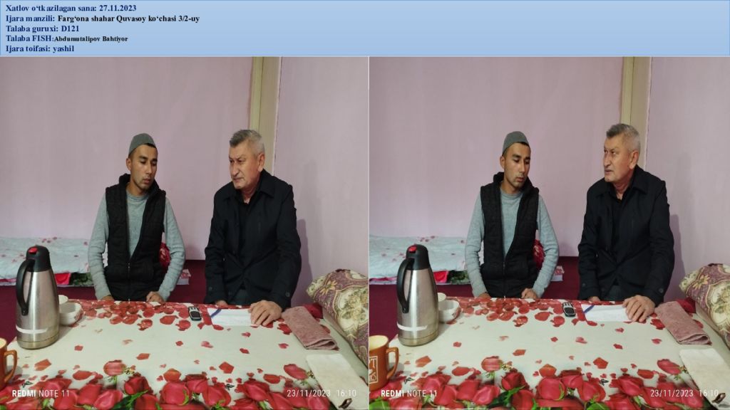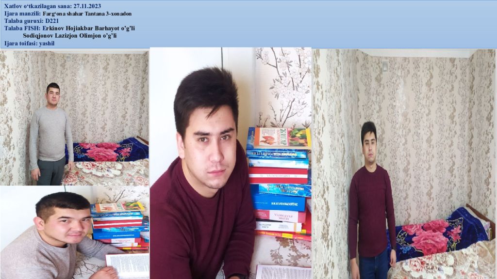 Xatlov o‘tkazilagan sana : 27.11.2023 Ijara manzili : Farg‘ona shahar Tantana 3-xonadon Talaba guruxi : D221 Talaba FISH : E rkinov Hojiakbar Barhayot o’g’li Sodiqjonov Lazizjon Olimjon o’g’li Ijara toifasi : yashil