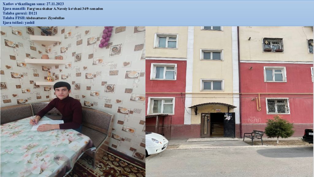 Xatlov o‘tkazilagan sana : 27.11.2023 Ijara manzili : Farg‘ona shahar A.Navoiy ko‘chasi 34/9-xonadon Talaba guruxi : D121 Talaba FISH : Abdusattorov Ziyodullao Ijara toifasi : yashil