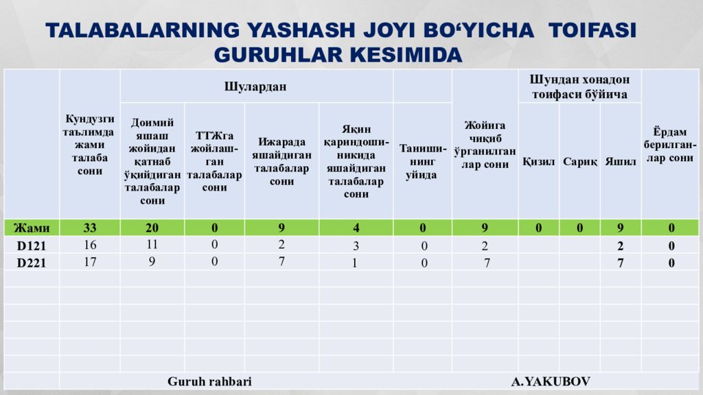 TALABALARNING YASHASH JOYI BO‘YICHA TOIFASI GURUHLAR KESIMIDA Кундузги таълимда жами талаба сони Шулардан Жойига чиқиб ўрганилганлар сони Шундан хонадон тоифаси бўйича Ёрдам берилган - лар сони Доимий яшаш жойидан қатнаб ўқийдиган талабалар сони ТТЖга жойлаш - ган талабалар сони Ижарада яшайдиган талабалар сони Яқин қариндоши - никида яшайдиган талабалар сони Таниши - нинг уйида Қизил Сариқ Яшил Жами 33 20 0 9 4 0 9 0 0 9 0 D121 16 11 0 2 3 0 2 2 0 D221 17 9 0 7 1 0 7 7 0 Guruh rahbari A.YAKUBOV