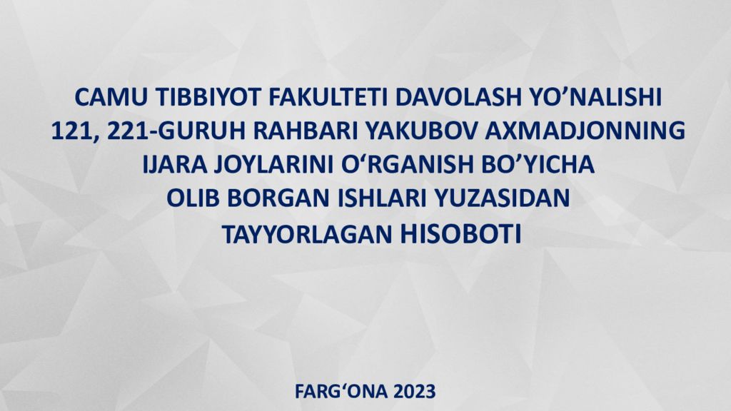 CAMU TIBBIYOT FAKULTETI DAVOLASH YO’NALISHI 1 2 1, 2 2 1 -GURUH RAHBARI YAKUBOV AXMADJONNING IJARA JOYLARINI O‘RGANISH BO ’ YICHA OLIB BORGAN ISHLARI YUZASIDAN TAYYORLAGAN HISOBOTI FARGʻONA 2023
