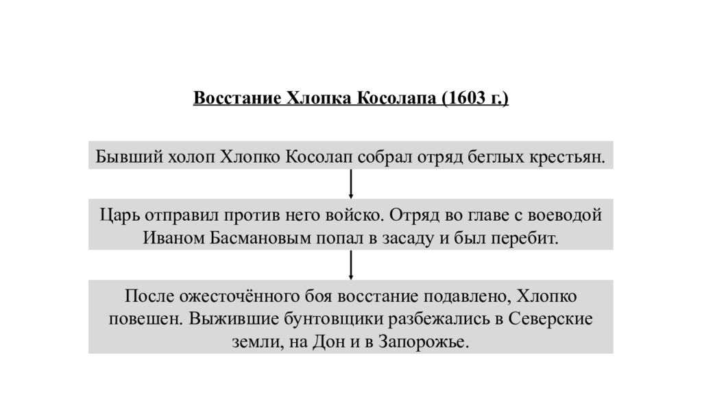Восстание Хлопка Косолапа (1603 г.) Бывший холоп Хлопко Косолап собрал отряд беглых крестьян. Обострение кризиса После ожесточённого боя восстание подавлено, Хлопко повешен. Выжившие бунтовщики разбежались в Северские земли, на Дон и в Запорожье. Царь отправил против него войско. Отряд во главе с воеводой Иваном Басмановым попал в засаду и был перебит.