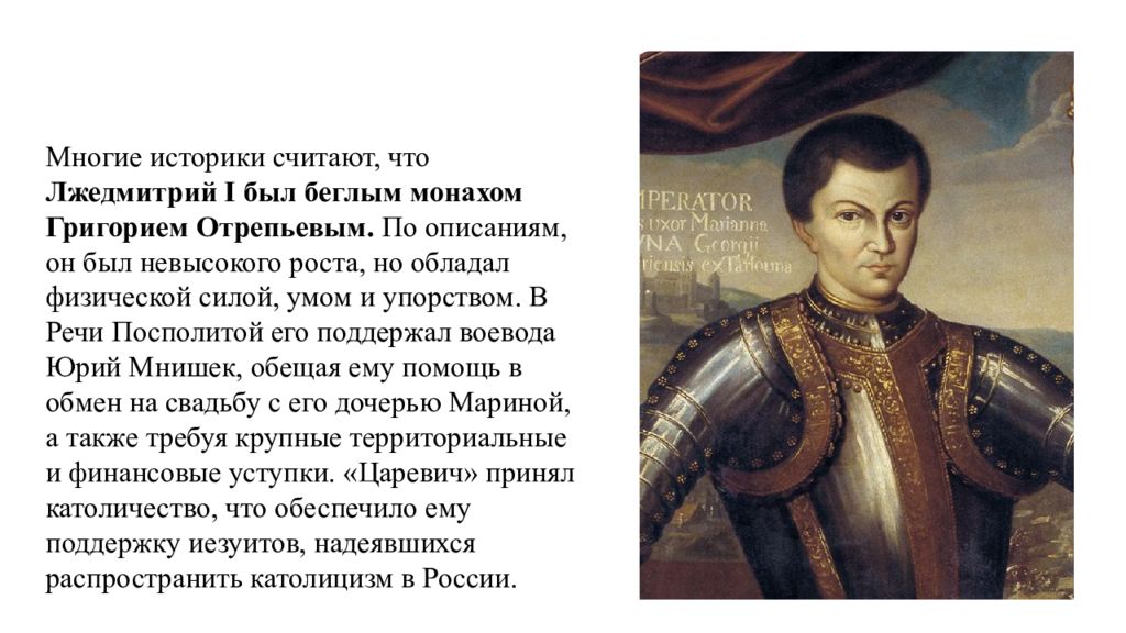 Лжедмитрий I Многие историки считают, что Лжедмитрий I был беглым монахом Григорием Отрепьевым. По описаниям, он был невысокого роста, но обладал физической силой, умом и упорством. В Речи Посполитой его поддержал воевода Юрий Мнишек, обещая ему помощь в обмен на свадьбу с его дочерью Мариной, а также требуя крупные территориальные и финансовые уступки. «Царевич» принял католичество, что обеспечило ему поддержку иезуитов, надеявшихся распространить католицизм в России.