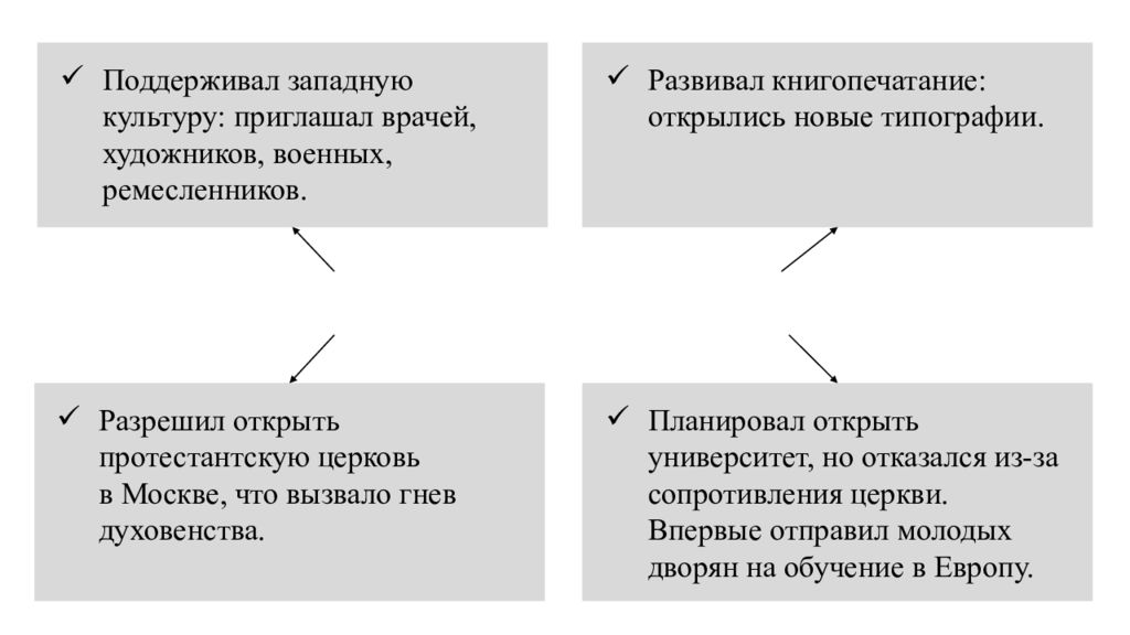 Поддерживал западную культуру: приглашал врачей, художников, военных, ремесленников. Внутренняя политика Годунова Развивал книгопечатание: открылись новые типографии. Разрешил открыть протестантскую церковь в Москве, что вызвало гнев духовенства. Планировал открыть университет, но отказался из-за сопротивления церкви. Впервые отправил молодых дворян на обучение в Европу.