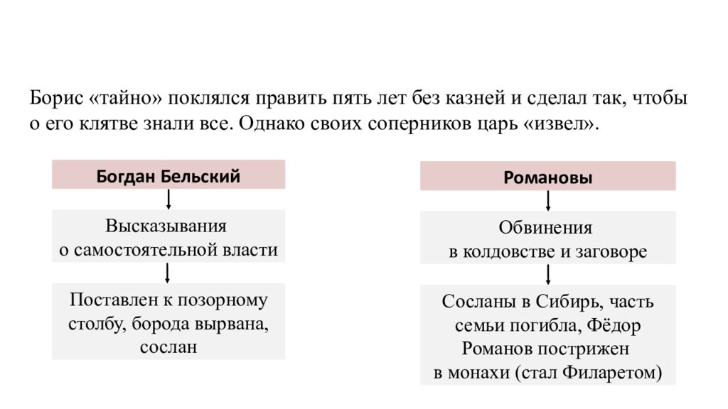 Внутренняя политика Годунова Борис «тайно» поклялся править пять лет без казней и сделал так, чтобы о его клятве знали все. Однако своих соперников царь «извел». Богдан Бельский Высказывания о самостоятельной власти Поставлен к позорному столбу, борода вырвана, сослан Романовы Обвинения в колдовстве и заговоре Сосланы в Сибирь, часть семьи погибла, Фёдор Романов пострижен в монахи (стал Филаретом)