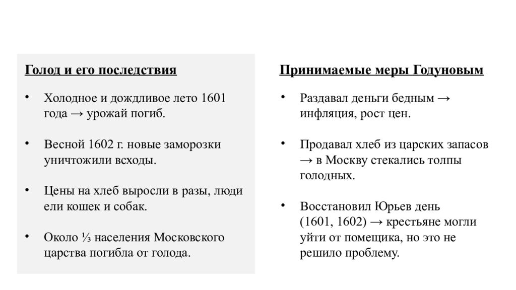 Обострение кризиса Голод и его последствия Холодное и дождливое лето 1601 года → урожай погиб. Весной 1602 г. новые заморозки уничтожили всходы. Цены на хлеб выросли в разы, люди ели кошек и собак. Около ⅓ населения Московского царства погибла от голода. Принимаемые меры Годуновым Раздавал деньги бедным → инфляция, рост цен. Продавал хлеб из царских запасов → в Москву стекались толпы голодных. Восстановил Юрьев день (1601, 1602) → крестьяне могли уйти от помещика, но это не решило проблему.