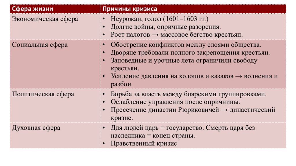 Сфера жизни Причины кризиса Экономическая сфера Неурожаи, голод (1601–1603 гг.) Долгие войны, опричные разорения. Рост налогов → массовое бегство крестьян. Социальная сфера Обострение конфликтов между слоями общества. Дворяне требовали полного закрепощения крестьян. Заповедные и урочные лета ограничили свободу крестьян. Усиление давления на холопов и казаков → волнения и разбои. Политическая сфера Борьба за власть между боярскими группировками. Ослабление управления после опричнины. Пресечение династии Рюриковичей → династический кризис. Духовная сфера Для людей царь = государство. Смерть царя без наследника = конец страны. Нравственный кризис