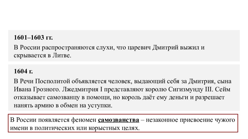 Появление самозванца 1601–1603 гг. В России распространяются слухи, что царевич Дмитрий выжил и скрывается в Литве. 1604 г. В Речи Посполитой объявляется человек, выдающий себя за Дмитрия, сына Ивана Грозного. Лжедмитрия I представляют королю Сигизмунду III. Сейм отказывает самозванцу в помощи, но король даёт ему деньги и разрешает нанять армию в обмен на уступки. В России появляется феномен самозванства – незаконное присвоение чужого имени в политических или корыстных целях.