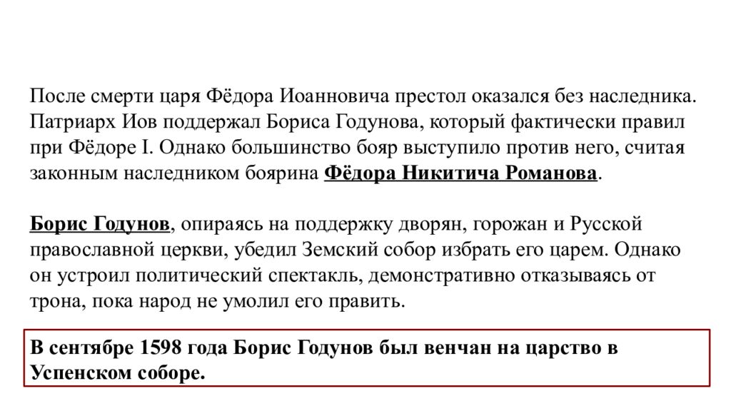 Избрание Бориса Годунова После смерти царя Фёдора Иоанновича престол оказался без наследника. Патриарх Иов поддержал Бориса Годунова, который фактически правил при Фёдоре I. Однако большинство бояр выступило против него, считая законным наследником боярина Фёдора Никитича Романова. Борис Годунов, опираясь на поддержку дворян, горожан и Русской православной церкви, убедил Земский собор избрать его царем. Однако он устроил политический спектакль, демонстративно отказываясь от трона, пока народ не умолил его править. В сентябре 1598 года Борис Годунов был венчан на царство в Успенском соборе.