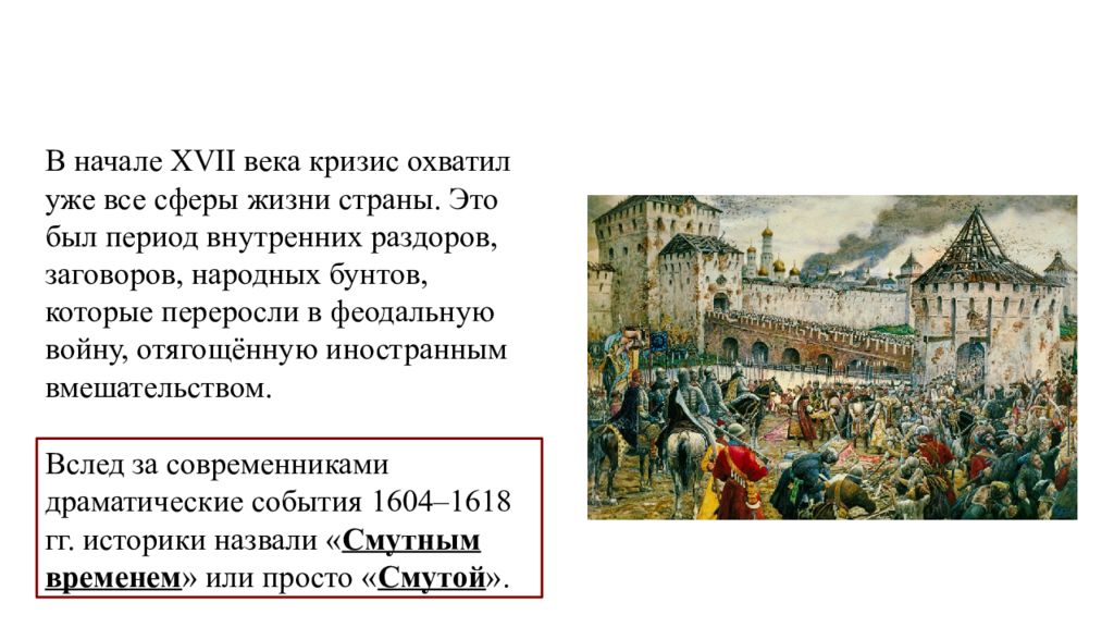Причины Смуты В начале XVII века кризис охватил уже все сферы жизни страны. Это был период внутренних раздоров, заговоров, народных бунтов, которые переросли в феодальную войну, отягощённую иностранным вмешательством. Вслед за современниками драматические события 1604–1618 гг. историки назвали « Смутным временем » или просто « Смутой ».