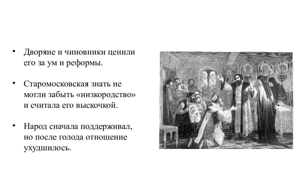 Отношение к Годунову Дворяне и чиновники ценили его за ум и реформы. Старомосковская знать не могли забыть « низкородство » и считала его выскочкой. Народ сначала поддерживал, но после голода отношение ухудшилось.
