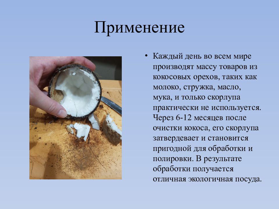 Каждый день во всем мире производят массу товаров из кокосовых орехов, таких как молоко, стружка, масло, мука, и только скорлупа практически не используется. Через 6-12 месяцев после очистки кокоса, его скорлупа затвердевает и становится пригодной для обработки и полировки. В результате обработки получается отличная экологичная посуда.