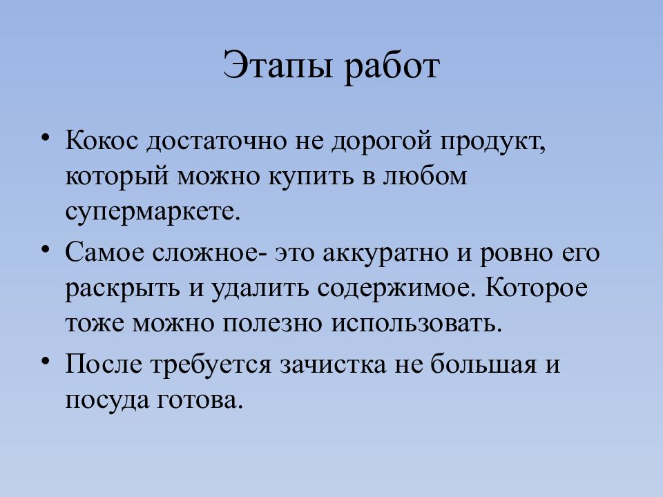 Кокос достаточно не дорогой продукт, который можно купить в любом супермаркете. Самое сложное- это аккуратно и ровно его раскрыть и удалить содержимое. Которое тоже можно полезно использовать. После требуется зачистка не большая и посуда готова.