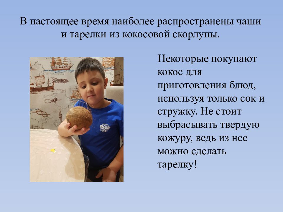 Слайд 4: В настоящее время наиболее распространены чаши и тарелки из кокосовой скорлупы