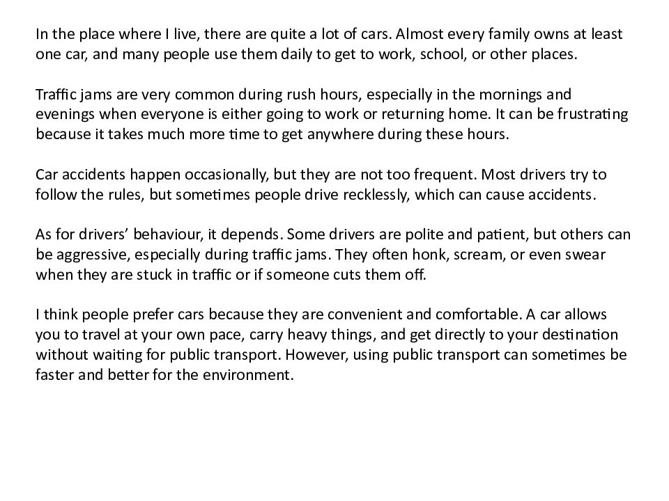 In the place where I live, there are quite a lot of cars. Almost every family owns at least one car, and many people use them daily to get to work, school, or other places. Traffic jams are very common during rush hours, especially in the mornings and evenings when everyone is either going to work or returning home. It can be frustrating because it takes much more time to get anywhere during these hours. Car accidents happen occasionally, but they are not too frequent. Most drivers try to follow the rules, but sometimes people drive recklessly, which can cause accidents. As for drivers’ behaviour, it depends. Some drivers are polite and patient, but others can be aggressive, especially during traffic jams. They often honk, scream, or even swear when they are stuck in traffic or if someone cuts them off. I think people prefer cars because they are convenient and comfortable. A car allows you to travel at your own pace, carry heavy things, and get directly to your destination without waiting for public transport. However, using public transport can sometimes be faster and better for the environment.
