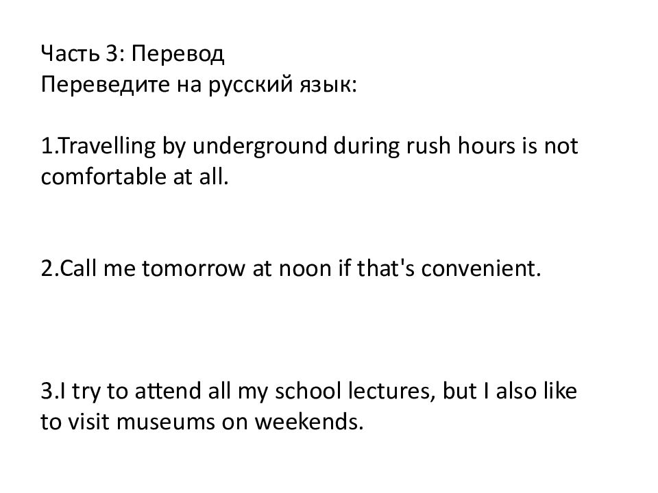 Часть 3: Перевод Переведите на русский язык : 1. Travelling by underground during rush hours is not comfortable at all. 2. Call me tomorrow at noon if that's convenient. 3. I try to attend all my school lectures, but I also like to visit museums on weekends.