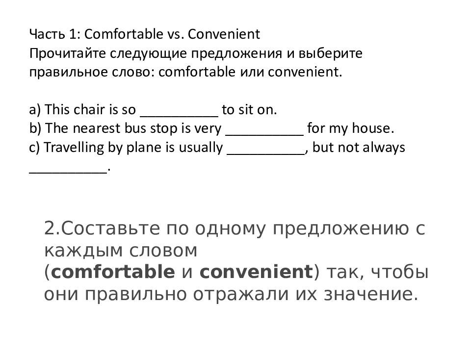 Часть 1: Comfortable vs. Convenient Прочитайте следующие предложения и выберите правильное слово: comfortable или convenient. a) This chair is so __________ to sit on. b) The nearest bus stop is very __________ for my house. c) Travelling by plane is usually __________, but not always __________. 2.Составьте по одному предложению с каждым словом ( comfortable и convenient ) так, чтобы они правильно отражали их значение.