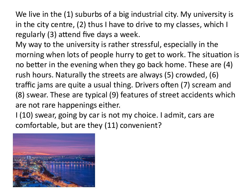 We live in the (1) suburbs of a big industrial city. My university is in the city centre, (2) thus I have to drive to my classes, which I regularly (3) attend five days a week. My way to the university is rather stressful, especially in the morning when lots of people hurry to get to work. The situation is no better in the evening when they go back home. These are (4) rush hours. Naturally the streets are always (5) crowded, (6) traffic jams are quite a usual thing. Drivers often (7) scream and (8) swear. These are typical (9) features of street accidents which are not rare happenings either. I (10) swear, going by car is not my choice. I admit, cars are comfortable, but are they (11) convenient?